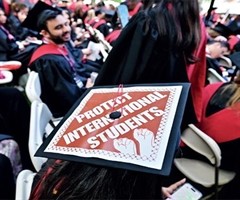 2025年5月29日,美国哈佛大学的毕业典礼上,一些毕业生的学位帽上写着“支持国际学生”的字样。图/视觉中国 几个月前,在美国新泽西州纽瓦克自由国际机场,方平经历了一段“难忘的人生体验”。他是清华大学理工科专业的博士生,应普林斯顿大学一名教...