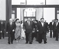 9月3日,纪念中国人民抗日战争暨世界反法西斯战争胜利80 周年招待会在北京人民大会堂隆重举行。中共中央总书记、国家主席、中央军委主席习近平出席招待会并发表重要讲话。这是习近平和夫人彭丽媛同出席招待会的外国领导人夫妇共同步入宴会厅。新华社记者...
