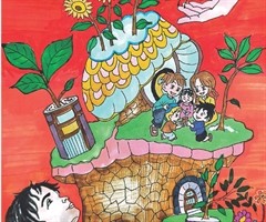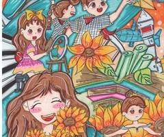 指导老师:杨淑颖 整幅画描绘了一个充满梦幻与生机的场景:鸟儿轻盈地飞翔,象征着自由与无忧;向日葵始终追随着太阳,代表着希望与坚定的信念;大手呵护着蝴蝶,传递温暖与安全感;石砌小屋则像是自然的庇护所,为探索世界提供了一个起点。 少年仰望着天空...