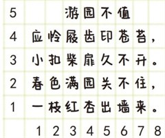 下图是小红写的一幅字。 (1)“印"字用数对表示是(【答案】 (1) (5,4)。 (2)游。 (3) (5,5) (6,3)(6,2)。 (4) 8、(8,4)。 【思路分析】 (2) (3,5)表示的汉字是“”字。 (3)诗中...