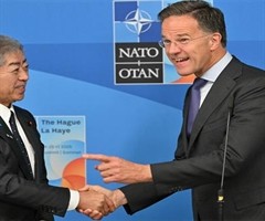2025年6月24日,北约海牙峰会召开,日本外务大臣岩屋毅(左)与北约秘书长吕特会面。 6月23日,日本首相石破茂突然在最后一刻决定不参加6月24日在荷兰海牙举行的北约峰会,这是日本首相近三年来的首次缺席。日本是北约“亚太四伙伴”(AP4,...