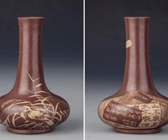 清华大学艺术博物馆藏有一件建水紫陶刻填残帖长颈瓶,口径4厘米、腹径11厘米、足径8厘米、高2 3厘米。此瓶细长直颈、平口、圆腹、圈足,器型规整,莹润周正,特别是在紫红色坯体上,装饰以黄、桔黄、桔红等色彩的碑帖、图案,凸显出紫陶特有的古拙苍凉...