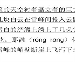 七月间,新疆的戈壁滩炎暑逼人,这时最理想的事是骑马上天山。 进入天山,戈壁滩上的炎暑就远远地被抛到后边。迎面送来的雪山寒气,立刻使你感到秋天般的凉爽。①蔚蓝的天空衬着矗立着的巨大的雪峰,几块白云在雪峰间投入云影,就像在雪白的绸缎上绣上了几朵...