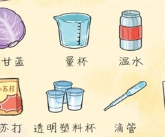 实验材料实验步骤 1 将紫甘蓝切碎并放入量杯中,倒入温水浸泡10分钟,得到紫甘蓝汁。2 将紫甘蓝汁分别倒入3个透明塑料杯中,并将第一杯作为“原色”参考。如果你有兴趣,还 可以在紫甘蓝汁中 加入柠檬水、白糖 水、可乐、雪碧等, 观察液体的颜色...