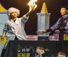 1月10日晚,新疆乌鲁木齐市,沉浸式儿童剧——互动科学秀《疯狂实验室》在新疆人民剧场演出。图为掌中火焰展示。 刘新摄...