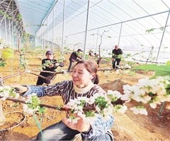 1月7日,临汾市浮山县天坛镇南霍村大棚樱桃种植基地,洁白如雪的樱桃花竞相绽放、清香扑鼻,村民正穿梭其间开展修枝、压枝、授粉等精细化管护作业,大棚内呈现出一派热闹景象。 闫锐鹏摄...
