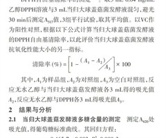 摘 要:当归与大球盖菇菌种双向发酵56 h,收集其发酵液,研究其抗氧化性能。蒽酮-硫酸法测定当归-大球盖菇发酵液的总糖含量,考马斯亮蓝G-250法测定其蛋白质含量,DPPH自由基清除法和钼酸铵比色法测定其抗氧化性能,测定紫外光区不同波长处发...