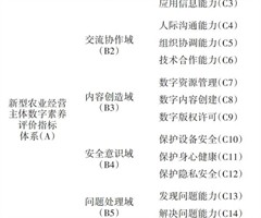 摘要 为构建新型农业经营主体数字素养评价指标体系,本文运用模糊层次分析法(FAHP)计算各指标权重,确定一个涵盖信息数据域、交流协作域、内容创造域、安全意识域、问题处理域、职业技能域等6个维度以及17个子指标的评价指标体系。结果显示,一级指...