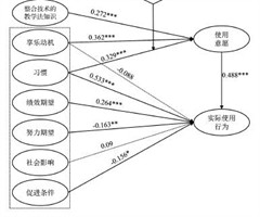 [摘 要] 文章基于技术接受与统一模型、整合技术的教学法知识理论,采用定量研究方法,分析中小学教师对常态化教学画像测诊技术的使用意愿及其实际使用行为的影响因素。研究发现:(1)习惯、整合技术的教学法知识显著正向影响使用意愿和实际使用行为...