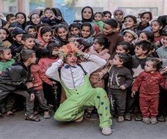 2024年2月17日,在遭受以色列袭击的加沙城,志愿者为巴勒斯坦孩子组织小丑表演活动。...