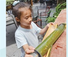 我刚做完作业,爸爸突然神秘地说:“今天咱们来做竹筒饭怎么样?”我早就想尝尝竹筒饭是什么味道了,便很高兴地答应了他。 第一步,爸爸从山上砍了一根细竹,表皮青黄,还带着淡淡的竹香。爸爸用锯子把竹筒锯成两截。我用刷子,把竹筒里里外外洗干净备用。 ...