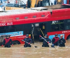 7月16日,忠清北道清州市,救援人员在洪水淹没的地下车道搜救幸存者。韩国中央灾难安全对策本部7月17日通报,截至当天23时,连续多日的强降雨已造成全国41人死亡,9人失踪。其中,忠清北道清州市某地下车道被水淹没,包括大巴在内的十余辆车被困,...