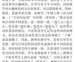 在小学语文教学中,词语属于最活跃的因素,词语教学既需要有行之有效的方法,又需要有灵活机动的策略,才能在夯实词语教学的基础上,提高学生的语言表达能力。 一、依据学段目标梯度教学 词语教学是贯穿整个小学阶段的学习内容,新课标在三个学段的“阅读与...