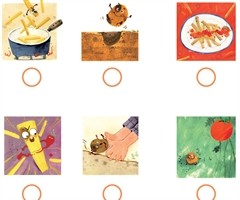 故事里的土豆和番茄发生了很多有趣的事情,以下每个小图里都藏着故事里的一个关键场景,请根据故事内容给这些图片排序,在空格里填上序号。故事里土豆和番茄在菜园里相遇,土豆都把番茄错认成了哪些东西?请你连一连。再和爸爸妈妈说一说,你觉得番茄还像什么...