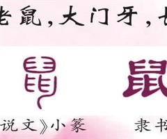 小老鼠,大门牙,长尾巴 “鼠”是一个历史悠久的象形字。 在甲骨文中,“鼠”是一个瘦瘦小小的动物,身后拖着长尾巴,有大大的门牙。它的嘴边还有几个点,就像老鼠咬掉的木渣一样。 《说文解字》中谈到“鼠”时说:“穴虫之总名也。”这个解释很有意思,“...