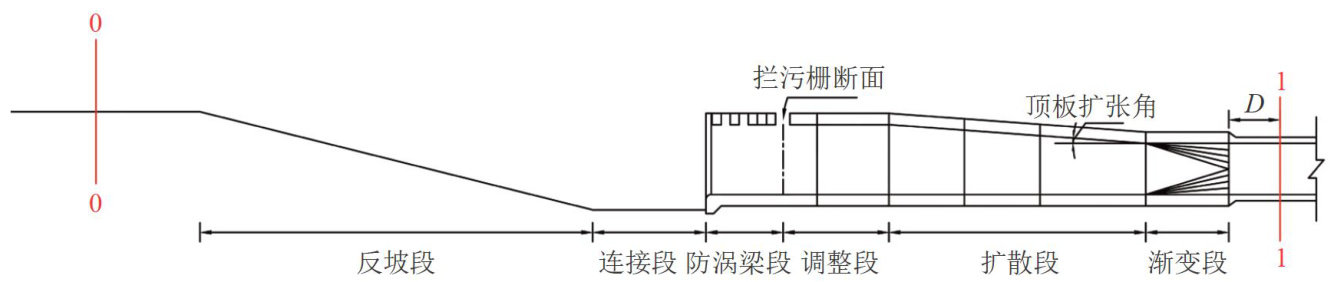 侧式进/出水口内设分流隔墙为多孔道结构,由扩散段、调整段和防涡梁段组成]。扩散段的设计传统上采用顶板单向扩张,顶板扩张角控制在 3∘~5∘ ,其依据是矩形渐扩管在阻力系数最小时所对应的扩张角度范围的一半[2]。(剩余13767字)
