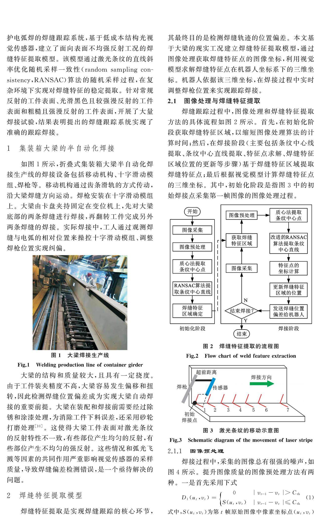 集装箱大梁自动焊接过程中,工件表面的反射不均匀、弧光、飞溅和烟尘等因素容易造成焊缝偏差识别不准确或难以稳定识别,因此设计了一种用于集装箱大梁熔化极气体保护电弧焊的焊缝跟踪系统。基于低成本结构光视觉传感器建立了高鲁棒的焊缝特征提取模型,该模型采用激光条纹的直线斜率对随机采样一致性算法的随机采样过程进行优化,以在复杂环境下实现模型对焊缝特征的稳定提取。(剩余10247字)