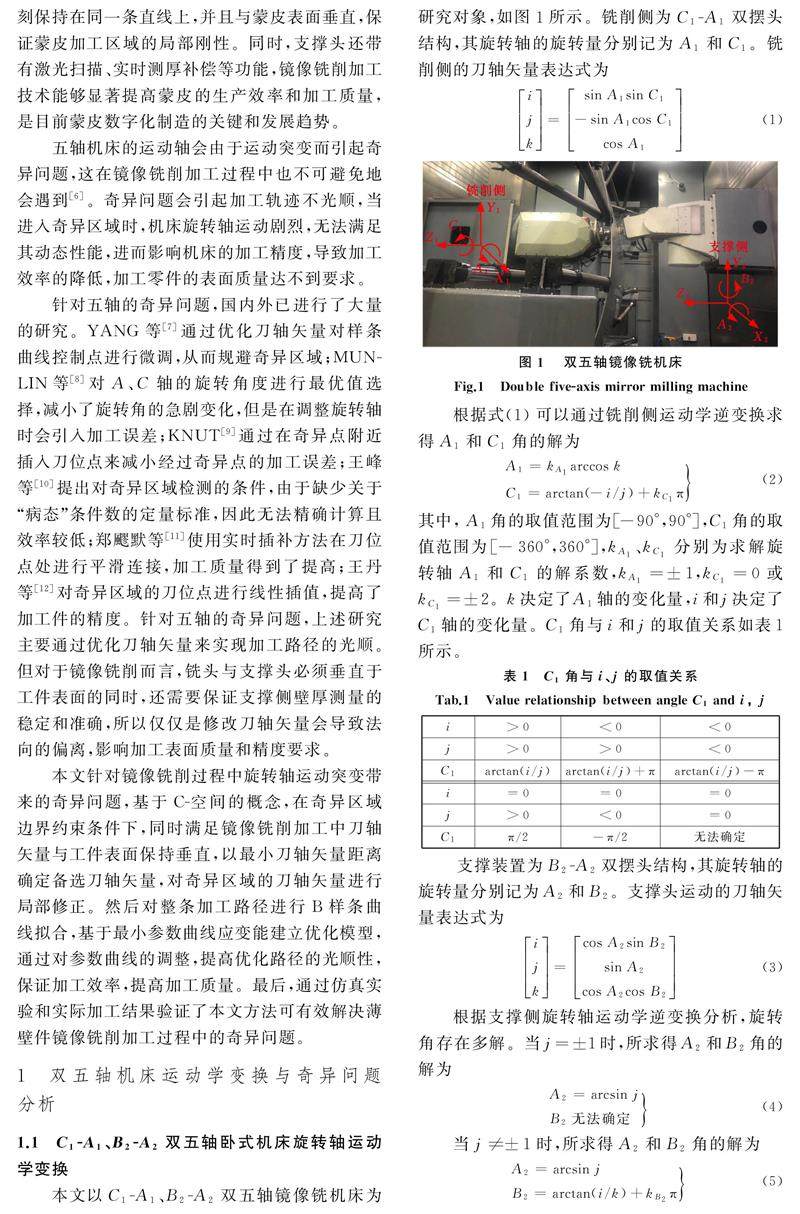 摘要:在双五轴镜像铣削加工中,由于旋转轴运动突变带来的奇异问题,导致薄壁件表面加工质量以及加工效率降低。在分析奇异问题产生原因的基础上,提出一种奇异区域加工路径优化的方法。基于C-空间的概念,在奇异区域边界约束条件下,同时满足镜像铣削加工中刀轴矢量与工件表面保持垂直,以最小刀轴矢量距离确定备选刀轴矢量,对奇异区域的刀轴矢量进行局部修正。(剩余9261字)