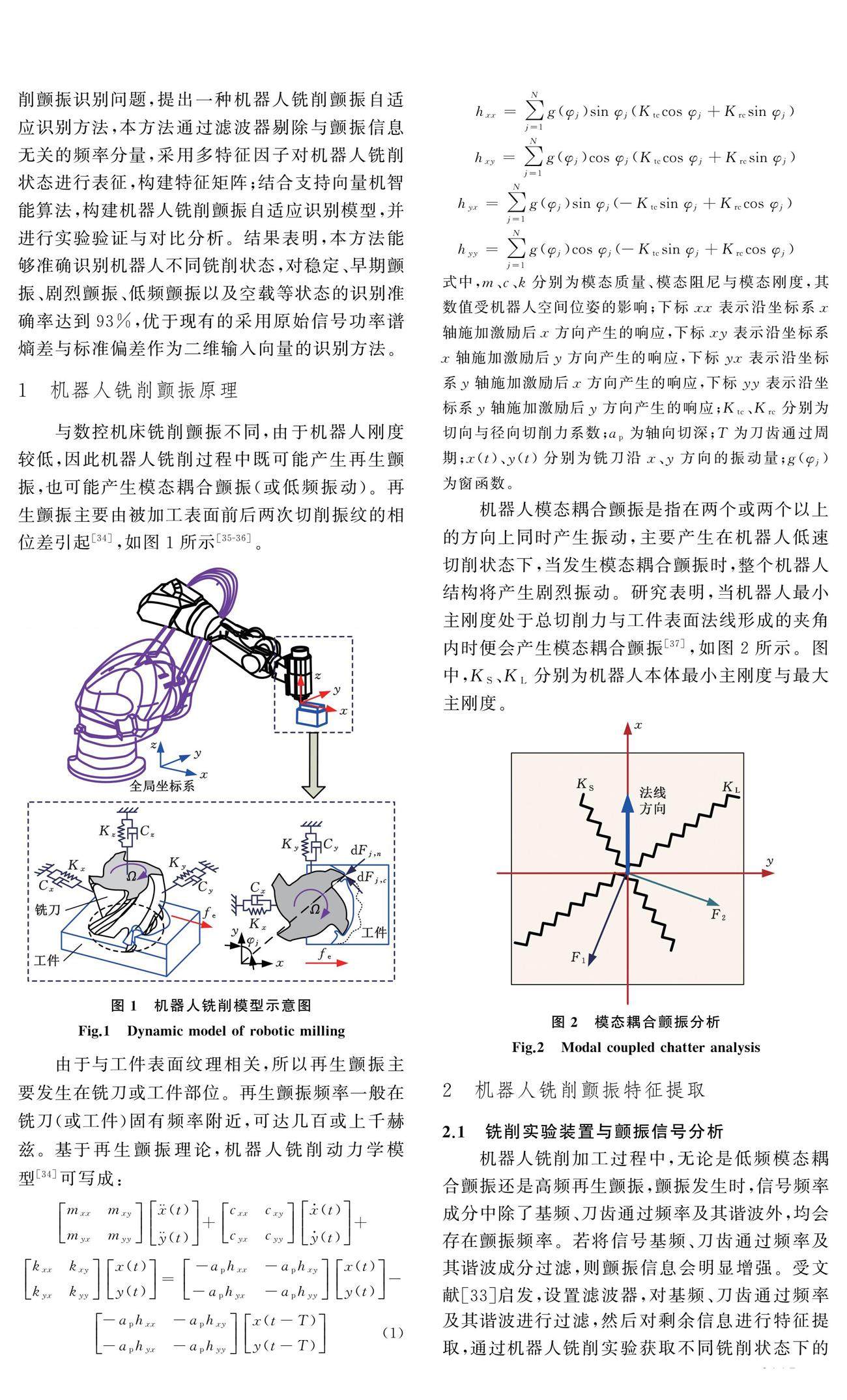 针对机器人铣削颤振形式复杂、难以有效识别的问题,提出一种机器人铣削加工颤振自适应识别方法。首先对原始振动信号进行信号分离,保留能够表征机器人加工状态的信息;然后采用不同信号功率谱熵之间的差值表征不同铣削状态下振动信号的频率分布特性,采用原始信号的标准偏差表征机器人铣削振动信号的时域特性。采用上述特征指标构建能够表征机器人不同铣削状态的三维特征向量矩阵,将特征向量输入支持向量机,构建机器人铣削加工颤振自适应识别模型。(剩余20379字)