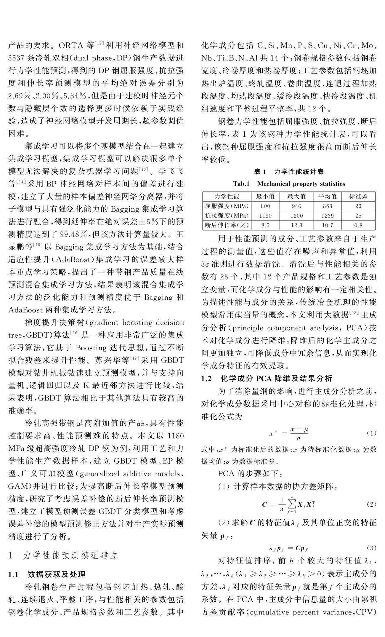 基于1180 MPa级超高强度冷轧双相(DP)钢卷生产数据,研究了基于主成分分析的化学主成分提取方法、网格搜索和交叉验证相结合的超参数寻优方法,建立了DP钢力学性能梯度提升决策树(GBDT)预测模型,并将预测结果与BP神经网络模型和广义可加模型的预测结果进行了比较。为了提高断后伸长率预测精度,以预测精度较高的GBDT预测模型为基础,通过模型预测误差分类模型和考虑误差补偿的模型预测修正方法,建立了考虑误差补偿的断后伸长率预测校正模型,该模型使断后伸长率在绝对误差±0.9%下的预测准确率达到了94.63%。(剩余10477字)