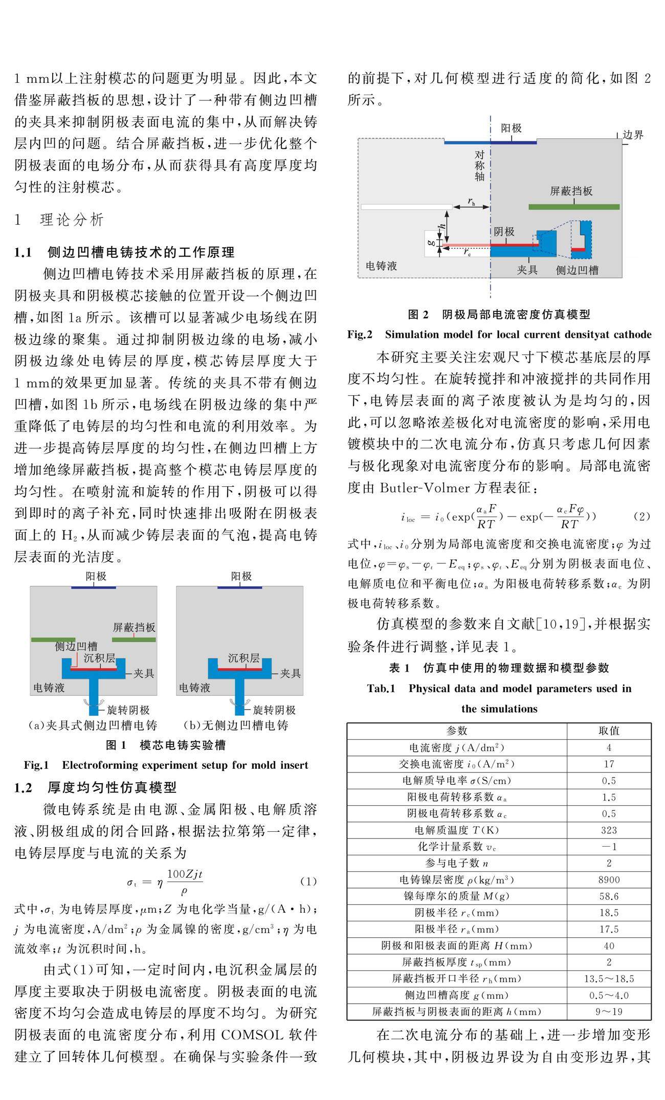 阴极边缘的电场分布不均匀导致模芯边缘的沉积速率高,严重降低电铸模芯的厚度均匀性。在屏蔽挡板工艺基础上,创新性地设计了具有侧边凹槽的阴极夹具。研究表明,沉积层厚度为0.1 mm时,采用该阴极夹具,在屏蔽挡板情况下的厚度不均匀性仅为4.3%,在无屏蔽挡板情况下的厚度不均匀性为16.5%。基于屏蔽挡板和侧边凹槽屏工艺,电铸成形了厚度1.1 mm、不均匀性小于8.0%的精密注射模芯。(剩余12787字)