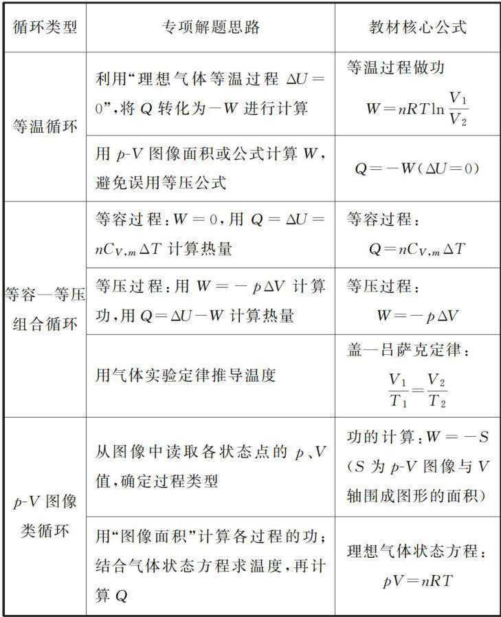 热力学第一定律作为高中物理选择性必修模块的核心内容,其在循环过程中的应用是新高考热学板块的高频考点,着重考查“情境化分析”与“定量计算”的综合运用能力.本文以新高考真题为基础,首先明确热力学第一定律与循环过程的核心概念;接着提炼新高考中循环过程的三类典型考向及相应解题思路;随后选取两道例题进行详细解(剩余2526字)