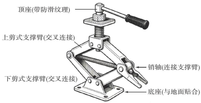 在汽车应急换胎、日常维护的场景中,剪式千斤顶是当之无愧的“得力助手”一—仅凭一人之力摇动手柄,就能将数吨重的汽车稳稳顶起,实现小力胜大力的神奇效果.但使用过程中难免产生疑问:为何纤细的手柄能撬动沉重车身?为何千斤顶能在任意高度稳稳锁定,不会因汽车重压自行回落?(剩余4066字)