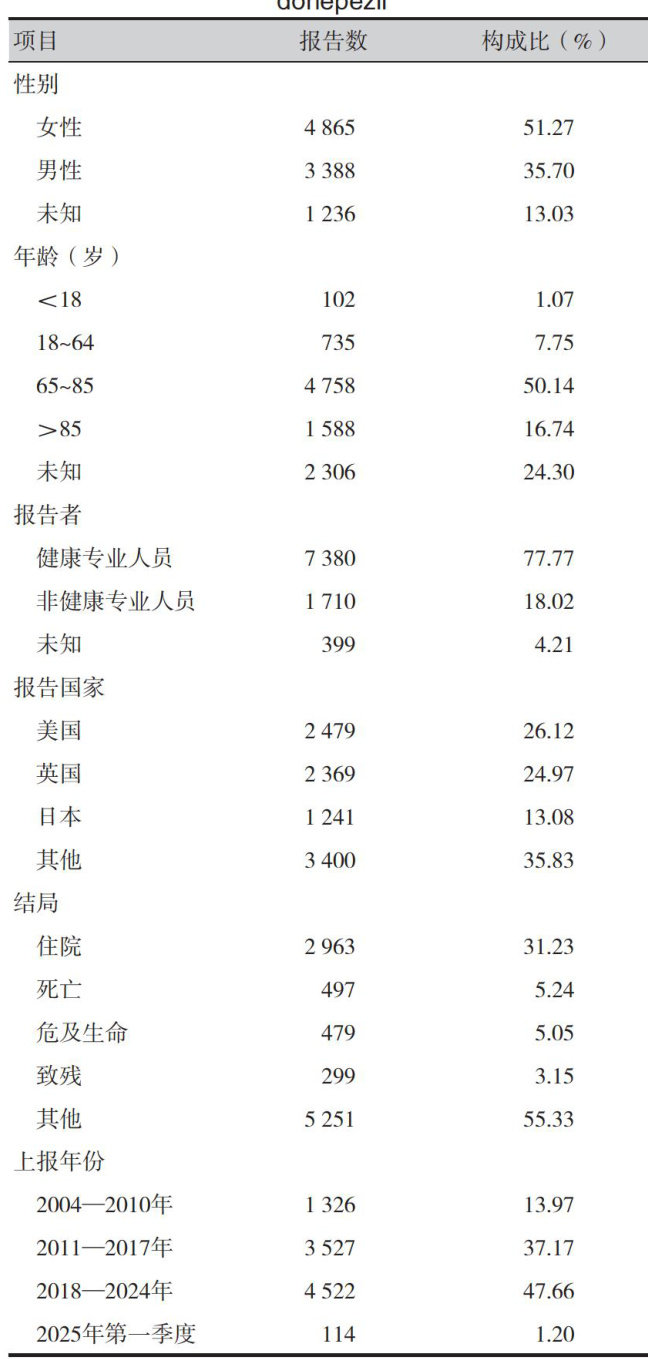 【Abstract】 Objective To mine and analyze adverse drug event (ADE) signals related to donepezil, and to elucidate its potential medication risk characteristics and promote safe clinical medication.Methods ADE reports associated with donepezil were retrieved from the U.S.Food and Drug Administration Adverse Event Reporting System (FAERS) database from first quarter of 2004 to frst quarter of 2025.The reporting ods ratio (ROR) method,proportional reporting ratio (PRR) method, Bayesian confidence propagation neural network method (BCPNN),and multi-item gamma-Poison shrinker (MGPS) method were used for signal dectection. Sex-specific subgroup analysis and time-to-onset (TTO) evaluation of ADEs were conducted,and sensitivity analyses were performed to assess the robustness of the findings.Results A total of 9,489 ADE reports with donepezil as the primary suspected drug were included, with the majority of patients being female (51.27% and aged ≥65 years (66.88% ). A total of 310 ADE signals were dectected involving 27 system organ classes (SOCs), including common ADEs such as bradycardia,vomiting, syncope,and altered consciousness,as wellas 21 potential new signals not previously listed in the drug label,such as opisthotonus,haemophilus bacteraemia, and visuospatial impairment.Sex-stratified analysis showed 201 ADE signals reported in males and 264 in females; gastrointestinal ulcer, mucosal hemorrhage and neurotoxicity were more common in males, while gastric emptying disorder,decompensated hypothyroidism,and QT interval prolongation posed greater risks in females. The median TTO for all ADEs was 48 days, with most events in both sexes occurring within one month of initiation,though some persisted for over a year.Sensitivity analysis demonstrated high stability and reliabilityof the ADE signalsassociated with donepezil.Conclusion Basedon large-scale real-world data,this study systematically identified both established and novel ADE profles associated with donepezil therapy. The findings elucidated sex-specificand temporal characteristics,providinga basis for the identification of high-risk populations and the development of individualized pharmacovigilance strategies.
