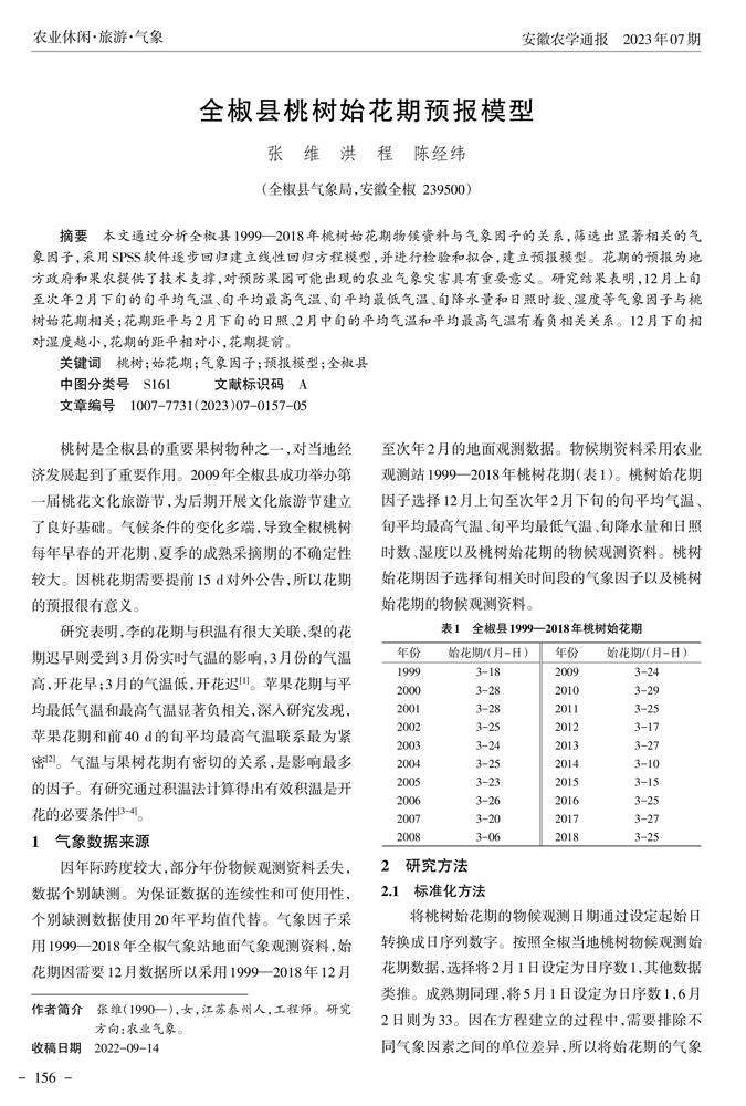 全椒县桃树始花期预报模型