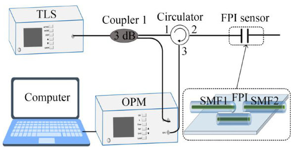 Abstract: Aiming at the problem of limited sensitivity of optical fiber salinity sensors,this paper proposed a high-sensitivity fiber optic Fabry-Perot (Fabry-Perot Interferometer,FPI) salinity sensor based on sparse sampling of a tunable laser. By controlling the sampling interval of the tunable laser to be close to the free spectral range(Free Spectral Range,FSR)of the FPI interferometric cavity,a vernier-like effect was formed in the spectrum. Under sparse sampling conditions,the interference signal generated adjustable envelope drift in the spectrum,which significantly amplified the refractive index perturbation caused by small salinity changes,thereby enabling high-sensitivity detection of salinity parameters.Experimental results demonstrate that the sensing system achieves a salinity sensitivity of up to 1.525nm/% within the range of 20‰ salinity,which is approximately 9.24 times higher than that of a single FPI interferometer structure.Compared with the traditional vernier efect method based on a dual-cavity interferomer ter structure,the present sensor does not require any modification to the existing structure and can flexibly control system sensitivity and enhance detection accuracy simply by adjusting the sampling interval of the tunable laser source.The method is simple to implement,highly compatible,and has broad application prospects in the fields of high-performance fiber optic sensing and marine environment monitoring.