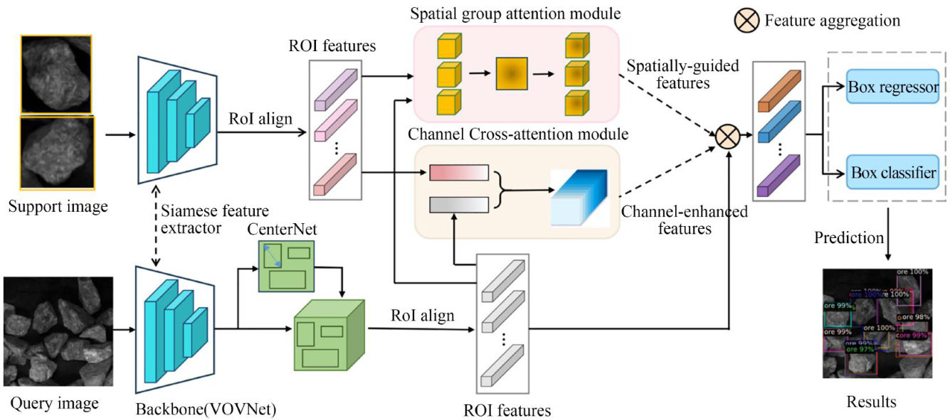 Abstract: To address the high computational complexity,limited feature robustness,and constrained classifier performance of conventional object detection methods in ore particle size detection,a few-shot object detection approach was proposed to reduce annotation cost and improve generalization under data-scarce conditions.The proposed method was built upon the CenterNet2 framework and employed a lightweight VoVNet as the backbone to ensure detection eficiency. A parallel dual-attention feature fusion module was designed as the core component. Specifically,a channel cross-attention module was introduced to re calibrate channel-wise feature responses,while a spatial group-atention module emphasized discriminative target regions. The coordinated operation of the two modules enhanced the fusion of task-relevant features and provided effective guidance for query image detection in few-shot scenarios. Experimental results on an ore dataset show that the proposed model achieved an average precision (AP) of 55.2% ,with AP50 and AP75 reaching 78.5% and 66.9% ,respectively. The inference speed reached 57 frames per second (FPS),while the attention module required only 16.1M parameters, indicating a favorable trade-off between accuracy and eficiency. Experimental results demonstrate that the proposed method efectively enhances the perception performance of few-shot ore particle size detection. Moreover,it possesses high potential for edge deployment,providing a reliable technical solution for real-time detection challnges in smart mines under computation-constrained conditions.