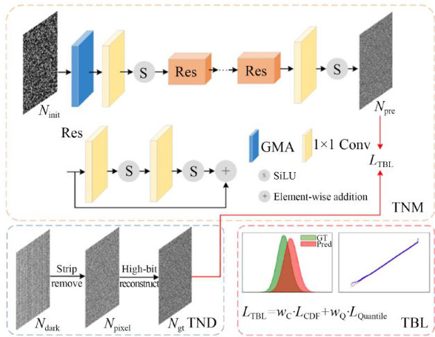 Abstract: Time-Delay Integration CCDs (TDI CCDs)are widely used in remote-sensing imaging. However,complex noise sources-including dark current,reset noise,and quantization noise-hinder accurate characterization of the signal-independent noise distribution of real sensors under low-light conditions. To address this challenge,a physics-guided deep neural network for TDI CCD noise modeling (PDNN) is proposed. Signal-independent noise is learned from dark-frame images and combined with signal-dependent noise modeled by a Poisson distribution,enabling accurate representation of the TDI CCD noise distribution in low-light scenes. First,a TDI CCD Noise Decoupling (TND) module decomposes dark-frame images into pixel-level noise with spatial independence.Next,a Gain and Multistage Adaptive(GMA) module,together with 1×1 convolutional layers in the TDI CCD Noise Modeling(TNM) backbone,maps the initial noise into a distribution space that closely matches the true noise level while preserving pixel-wise independence. Finally,a Task Balanced Loss(TBL) dynamically adjusts weighting factors to maintain training equilibrium, further improving performance. On a self-constructed dataset,the proposed method achieves an average Kullback-Leibler divergence(AKLD) of 0.106 9,demonstrating substantial improvements over existing approaches. Moreover,PSNR and SSIM obtained from models trained with synthetic noisy images closely approximate those achieved with real data.Experimental results indicate that PDNN effectively characterizes the low-light noise distribution of TDI CCDs,providing practical value for enhancing the visual quality of low-light remote-sensing imagery.
