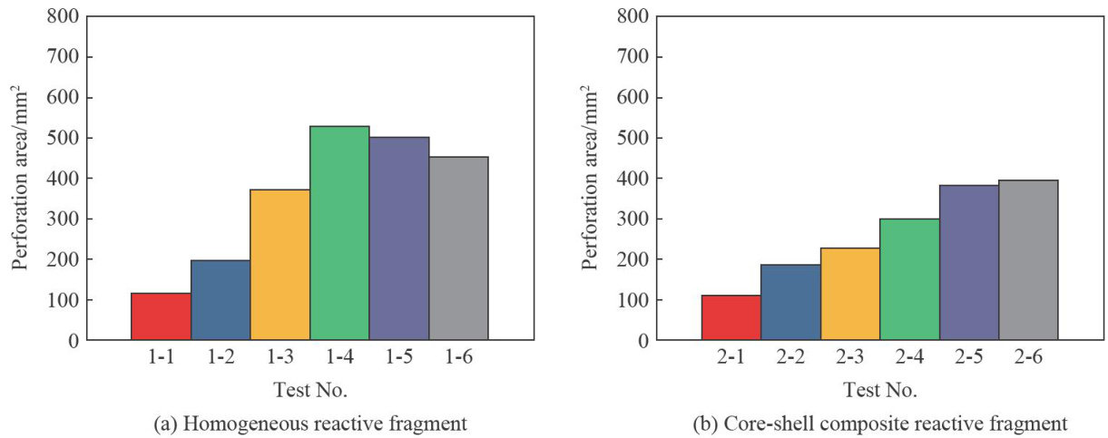 Abstract:To enhance the damageeficiencyoffluoropolymer-based reactivefragments andbroaden their applicationrange,a novelcore-shellompositestructureactivefragmenthaseenproposed.Toimprovethestrengthofthematrixmaterial,arbon fiber was introduced via a wet mixing method. Under specific sintering conditions,two types of samples were prepared: PTFE/AI/CF tungsten powder and PTFE/A/CF tungsten ballThe basic mechanical properties of these samples were tested. The addition of tungsten powder was found to increase the dynamic compresive strength of the composite.Penetration tests were conducted on 3mm+3mm+2mm+2m m multi-layer interval aluminum targets using both types of fragments. The experimentaldata wereautomaticallprocessedusingaPython-based program,yieldingtheperforationareadeforation volume,andreactionlightintensityforeachlayerofthetargetplate.Thedamagecharacteristicsofthemulti-intervaltarget under diffrent velocityand constraint conditions were compared and analyzed.Theresults show thatthe core-shelltype fragment exhibits superiorpenetrationability.Itcanpenetrate allfourlayersofthetarget plates atlowspeeds,although the perforationareaiselativelysall,withaperforationdiameterapproximatelyO.95timesthefragmentdameter.Iotrast,te homogeneous fragment has alargerperforation area but weaker penetrationability.Its perforation diameter is about1.2l times thefragment diameter,and itcanonly penetrate threelayersof target plates at high speeds.Thesteel shellconstraint significantlyenhances thepunchingandpenetrationcapabilitiesof thefragments.Theprimaryactivereactionofthefragment occurs during impact withthesecond layer ofthetarget.Theenergyreleasereaction hasalimited efect on improving the punching effect.The differences indamage characteristicsare mainlyatributedtothemechanical propertiesofthe fragments. Thesefindings provide valuable insights for the structural design and damage effect evaluation ofreactive fragments.