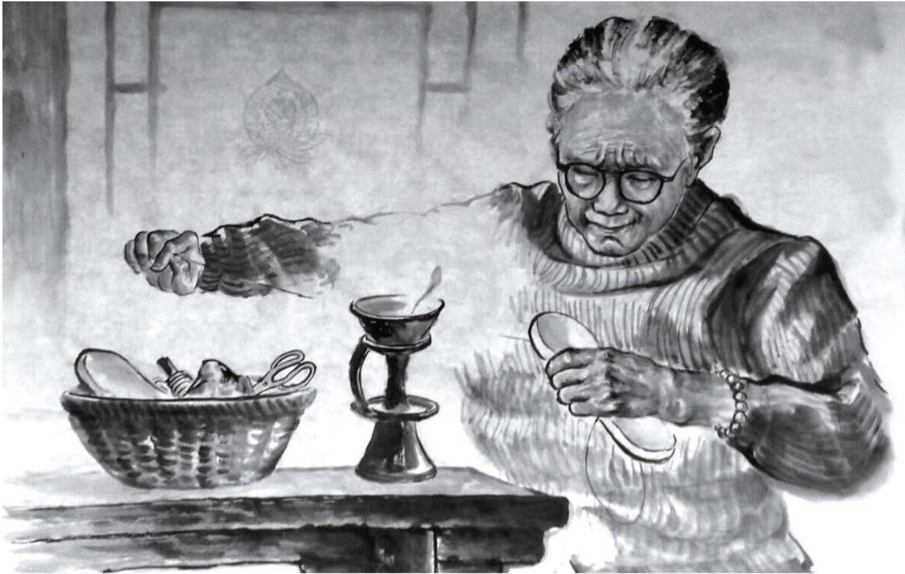 我以为家里来了客人,再一听,只有母亲在说话,而且一直在说,边说边笑。我悄悄走到门边,见母亲指着客厅里的穿衣镜说:“你这个人怎么到我家里来了?来了又不说话,还学我的样子.."
