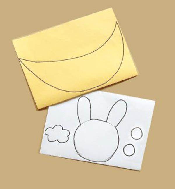 1.把白色和黄色彩纸对折,在上面分别画出月亮、云朵和兔子形状。