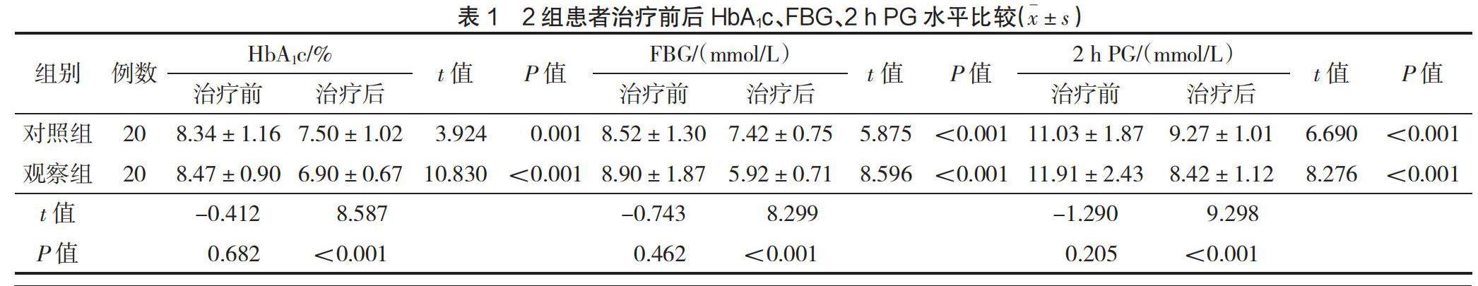 【摘要】 目的 探讨司美格鲁肽联合二甲双胍治疗肥胖型2型糖尿病的临床疗效分析。方法 将2021年10月—2022年6月于溧阳市人民医院内分泌科治疗的40例肥胖型2型糖尿病患者随机分成2组,每组20人,2组患者均予糖尿病饮食及运动干预,均应用二甲双胍降糖治疗。对照组仅采用二甲双胍降糖治疗,观察组在二甲双胍治疗的基础上加用司美格鲁肽降糖治疗,比较治疗后观察组及对照组患者空腹血糖(fasting plasma glucose,FBG)、餐后2 h血糖(2-hour post-load blood glucose,2 h PG)、糖化血红蛋白(glycated hemoglobin,HbA1c)、体质量指数(body mass index,BMI)等指标变化。(剩余6810字)