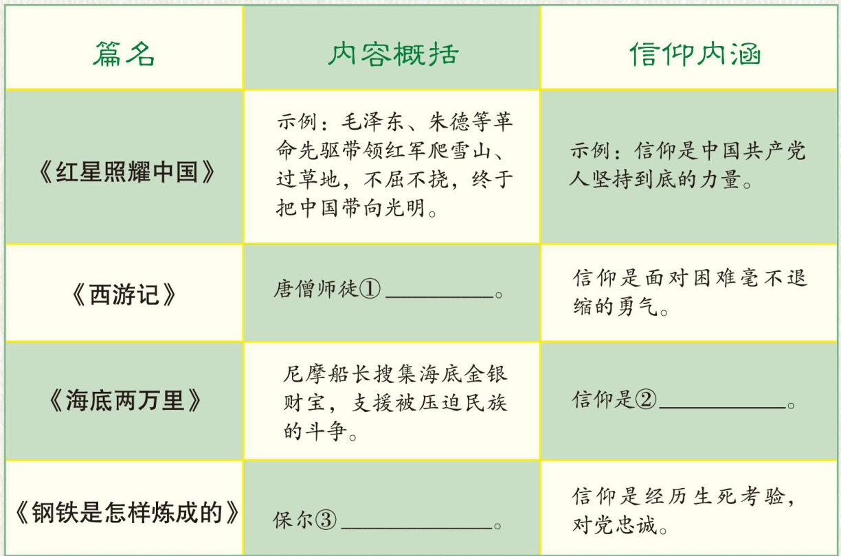 班级开展“名著中的信仰”专题探究活动,请完成以下任务:1.请你仿照示例完成内容概括、补全信仰内涵。