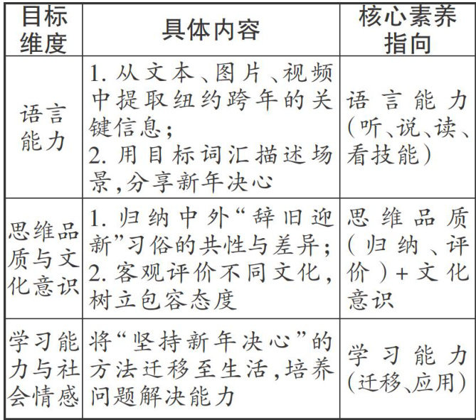 《义务教育英语课程标准(2022年版)》(以下简称“新课标”明确提出,英语课程需培养学生“语言能力、文化意识、思维品质、学习能力”四大核心素养,其中“文化意识”要求学生尊重文化多样性,树立文化自信。本课以“辞旧迎新”主题为纽带,将四大素养拆解为可操作的教学环节,以实现“素养目标”与“教学行为"的精准对接。(剩余4186字)