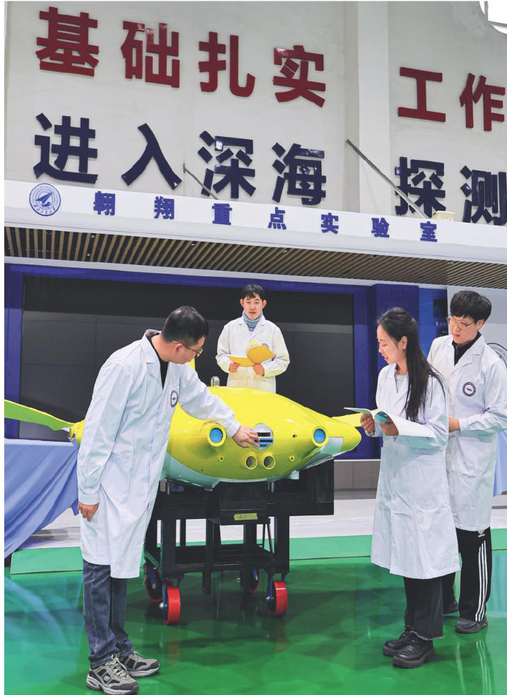 团队成员在实验室围绕水下航行器样机进行研讨