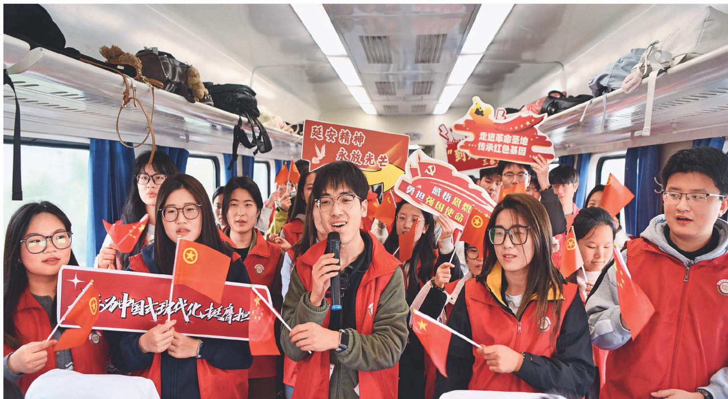 师生在列车上齐声高唱《我和我的祖国》等红色歌曲