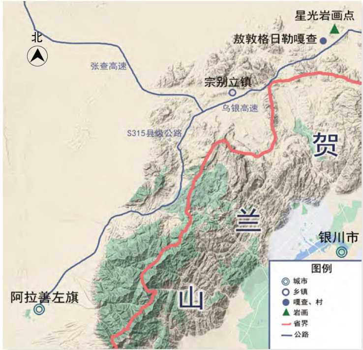 星光画位于阿拉善盟阿拉善左旗宗别立镇敖敦格日勒嘎查东北2.7公里、乌银高速公路西侧。岩画所在山体为贺兰山西麓余脉,平均海拔1428±20米。岩画分布在低矮的山梁上,2个地点共发现21组岩画。岩石属页岩,呈黑棕色。初步推断岩画制作年代为西汉至魏晋南北朝时期。岩画多采用凿刻手法作画,内容多为狩猎牧羊图,制作手法和内容具有典型的北方民族地区特点,是曾在这里生活过的游牧民族文化信仰最直接的体现。(剩余3480字)