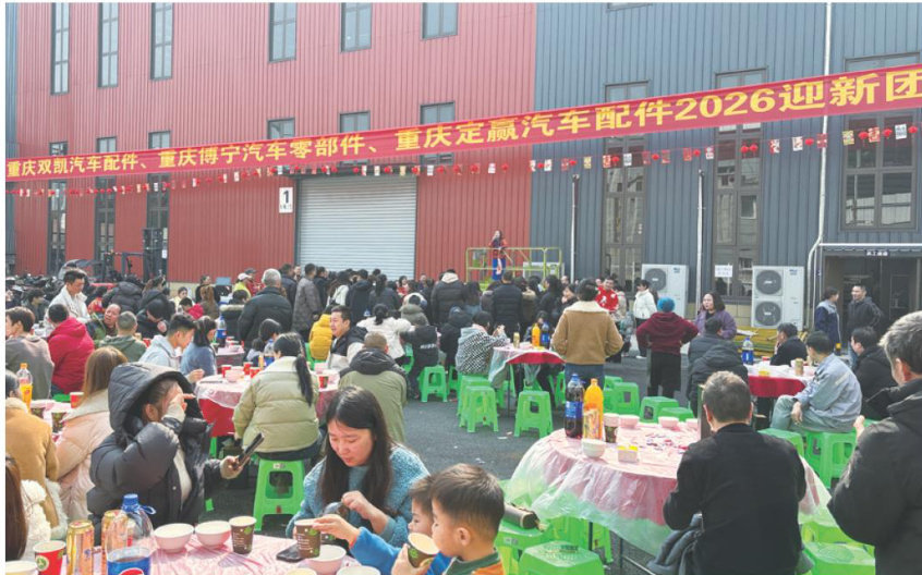 这是公司为员工们举办的团拜宴,宴席规模接近300人。”重庆双凯汽车配件有限公司综合经理罗宏笑着说,这次宴席就在厂区院坝举办,大家从车间出来,就能直接走到饭桌前品尝美食。