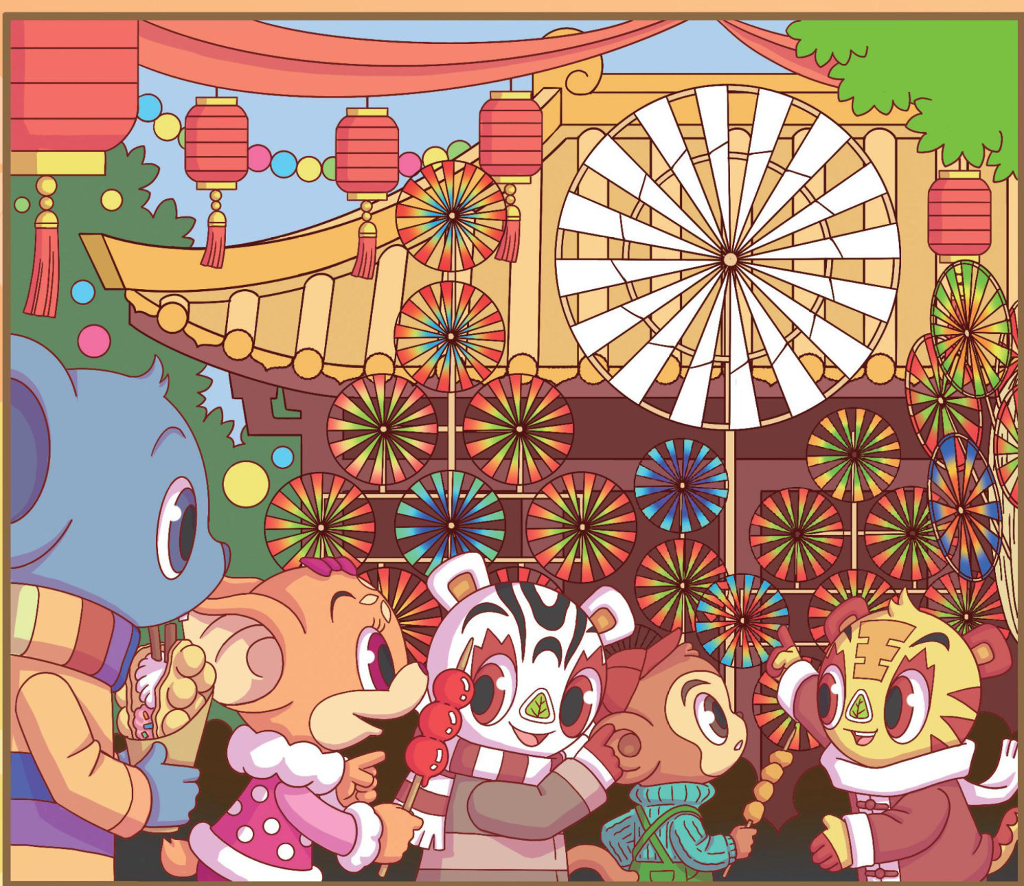 春节一到,各地的庙会就热热闹闹地开起来了。布老虎和伙伴们一起逛庙会,发现了很多好玩儿的、好吃的,尤其是一个摊位上的大风车,让大家看得入了迷,谁都不想走了。
