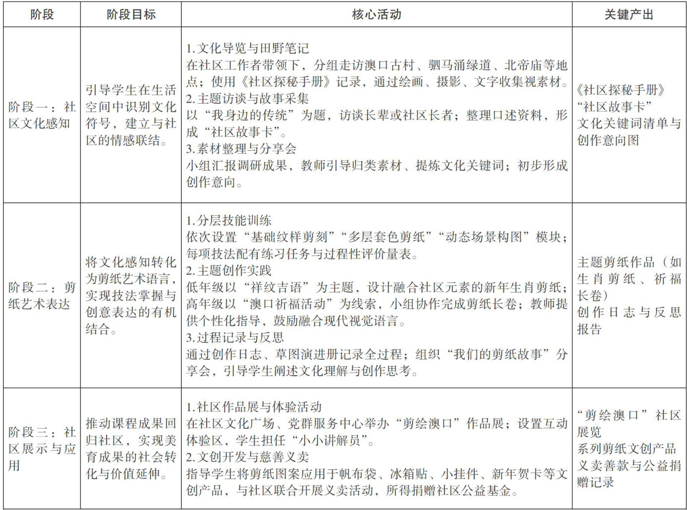 《关于全面加强和改进新时代学校美育工作的意见》提出推动美育资源向社会开放,强化家校社育人合力。剪纸艺术是连接学校美育与社区文化传承的理想纽带。本校位于荔湾区南源街道,社区文化资源丰富,如澳口村北帝诞、驷马涌历史景观等,但在现代化进程中,这些资源未在学校教育中有效转化,学生对社区文化认知较浅,剪纸教学与社区生活联系不足,且社区文化传承面临参与者老龄化、传播形式陈旧等问题。(剩余2257字)