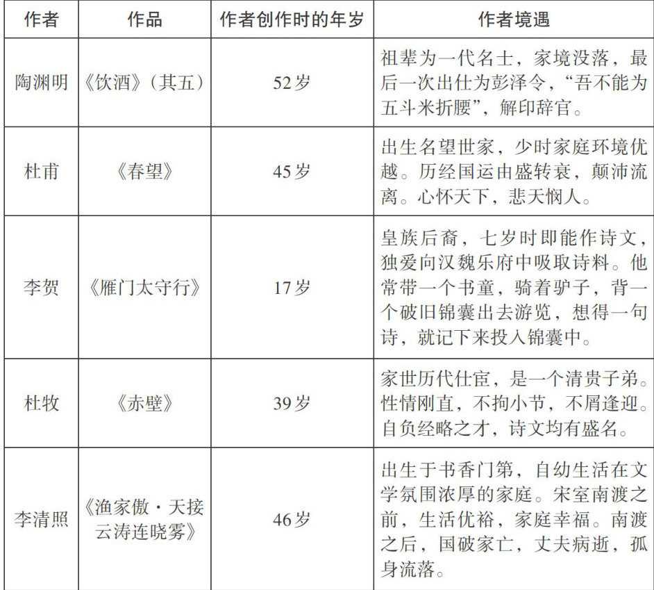 统编教材八年级上册第26课《诗词五首》中的五首作品分别是:陶渊明的《饮酒》(其五)、杜甫的《春望》、李贺的《雁门太守行》、杜牧的《赤壁》以及李清照的《渔家傲·天接云涛连晓雾》,教材是按作者所处的时代的顺序编排这五首诗词的:东晋——盛唐——中唐——晚唐——宋代。时代不同,诗歌创作的形式也有所变化,这五首作品在体裁上有古体诗、近体诗,也有词,五首作品在教材中既有的排序大体呈现了我国古代诗歌的发展脉络。(剩余2529字)
