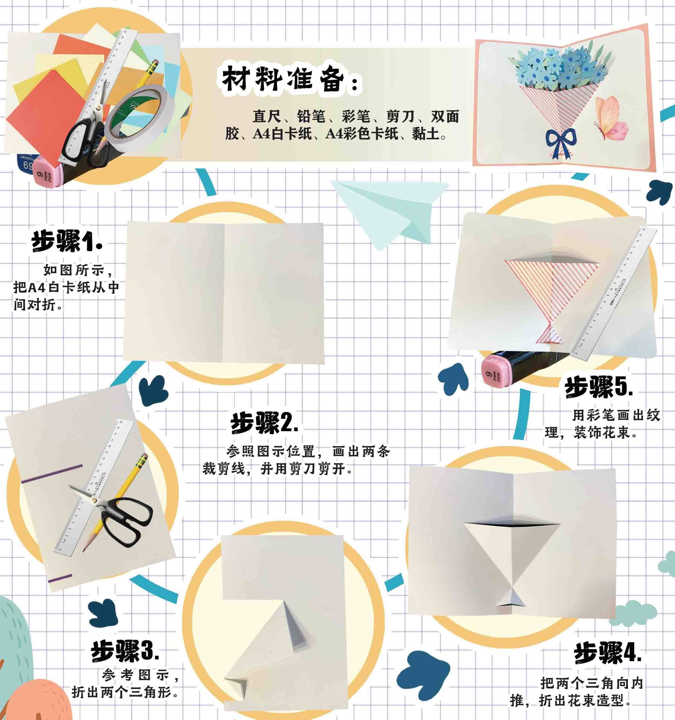 直尺、铅笔、彩笔、剪刀、双面胶、A4白卡纸、A4彩色卡纸、黏土。