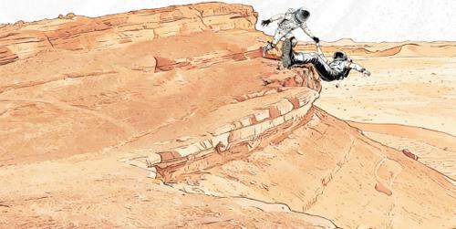 火星的暮色比地球来得更加突然。太阳仿佛被红色沙砾抽走了力量,光线被沙尘削弱,逐渐变成淡蓝色贴着赭红色的地平线缓缓下沉,将少年们的影子拉得很长,投射在布满尖锐砾石的斜坡上,宛如四道歪歪扭扭的墨痕,与红褐色的大地相互映衬,颇有大漠驼队的韵味。