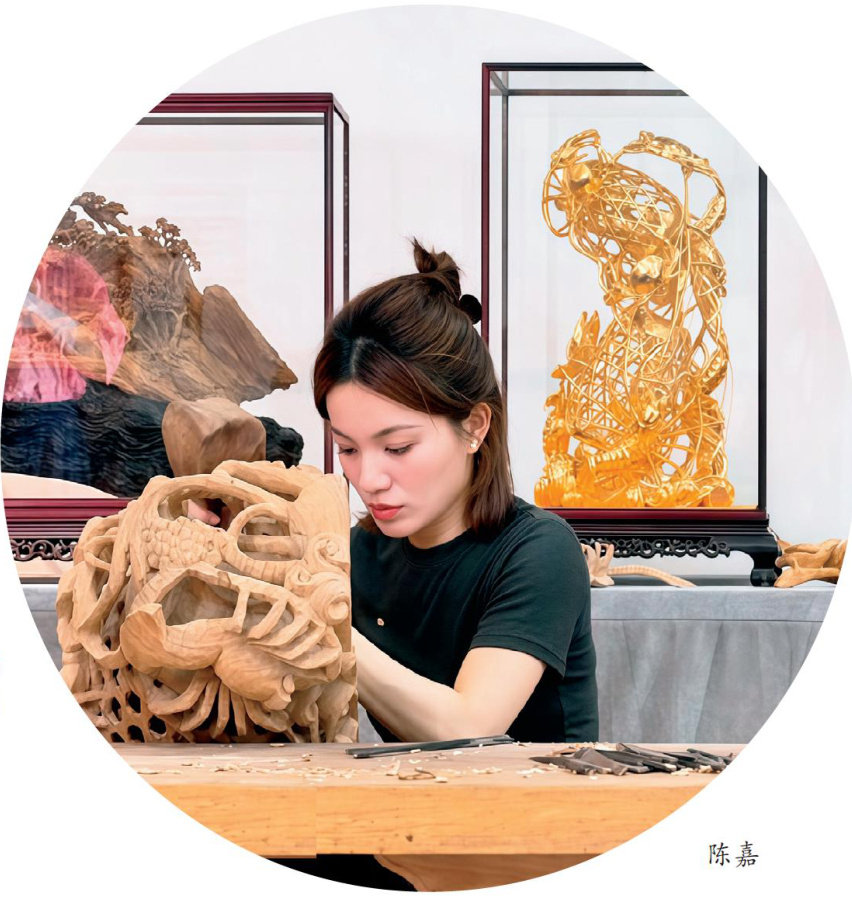 作为中国工艺美术大师陈舜羌的孙女、广东省高级工艺美术师陈培希的女儿,陈嘉踩着祖辈与父辈的匠心足迹,走出了不一样的青春路径一一把动辄数尺的传统木雕缩小成打火机大小的文创产品,让非遗走进校园和街巷