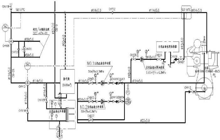 船舶主机的高温冷却水系统是保障主机正常运行的关键部分,主要用于带走燃烧和摩擦产生的热量,防止设备过热损坏[。为此,主机高温淡水冷却系统往往设有由海水冷却的高温淡水冷却器。为了节能,不少船舶配置造水机,以利用其主柴油机缸套水热量蒸发海水制造淡水。主机缸套水多采用闭式循环系统,所增造水机往往与主机高温水冷却器串联在主机高温缸套水管路上,并各设旁通管路,且在各旁通管路上设三通温控阀,以自动调节高温冷却淡水温度,保证各相关设备能在设定的温度范围内稳定运行。(剩余4139字)
