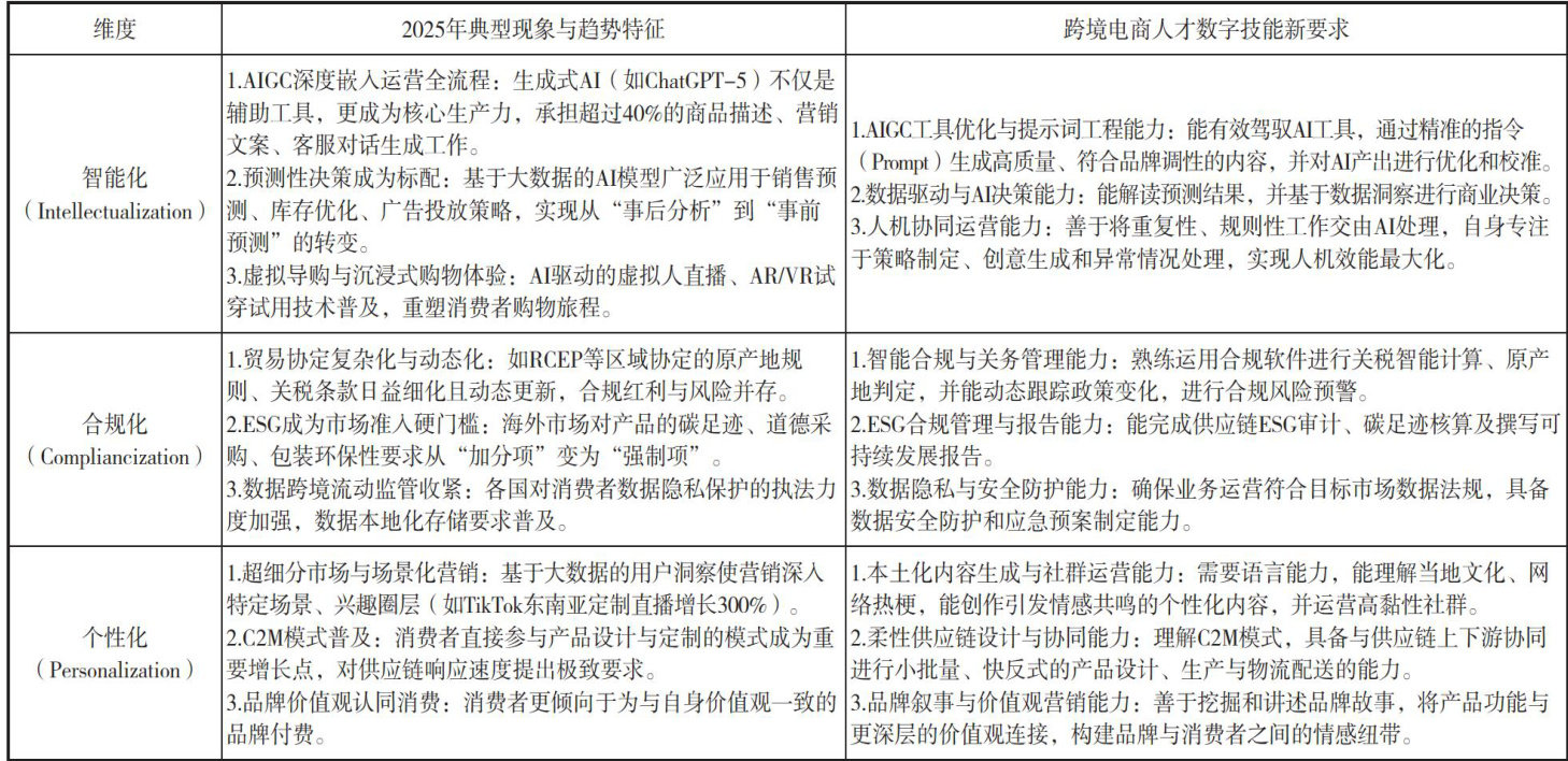 跨境电商作为数字经济与国际贸易深度融合的典型业态,已成为我国外贸高质量发展的重要引擎和新动能,跨境电商产业正步入以“智能化、合规化和个性化”为特征的深度升级阶段。这一升级不仅体现在营销渠道的多元化以及物流方案的优化,更在于对产业链各环节进行数字化赋能和智能化改造。具备数字营销、数据运营、智能客服、供应链管理等复合型数字技能的高素质技术技能人才已成为决定企业能否在激烈的国际竞争中脱颖而出的关键要素。(剩余4032字)